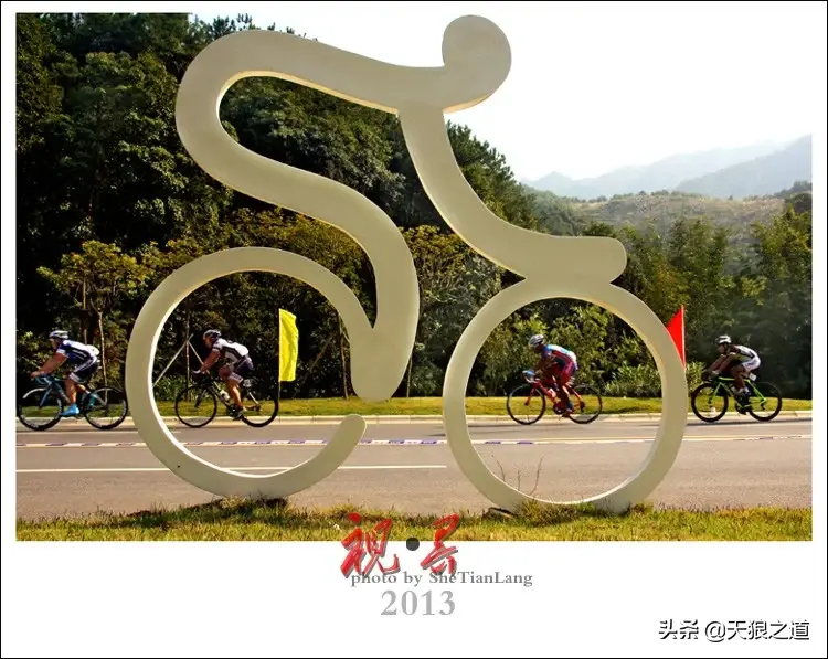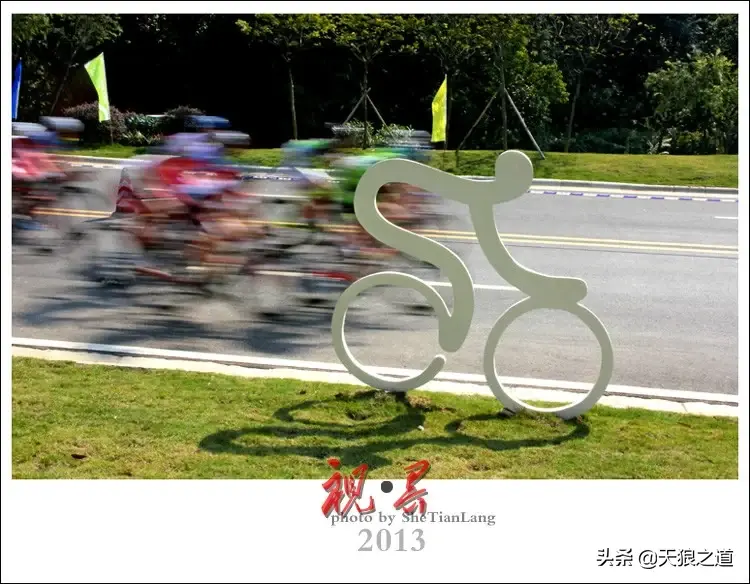 2、寻找赛道特定的参照物,增加赛事的趣味点。 比赛路线,刚好发现路边有自行车手的创意雕塑,守株待兔的等待目标进入需要的画面位置。