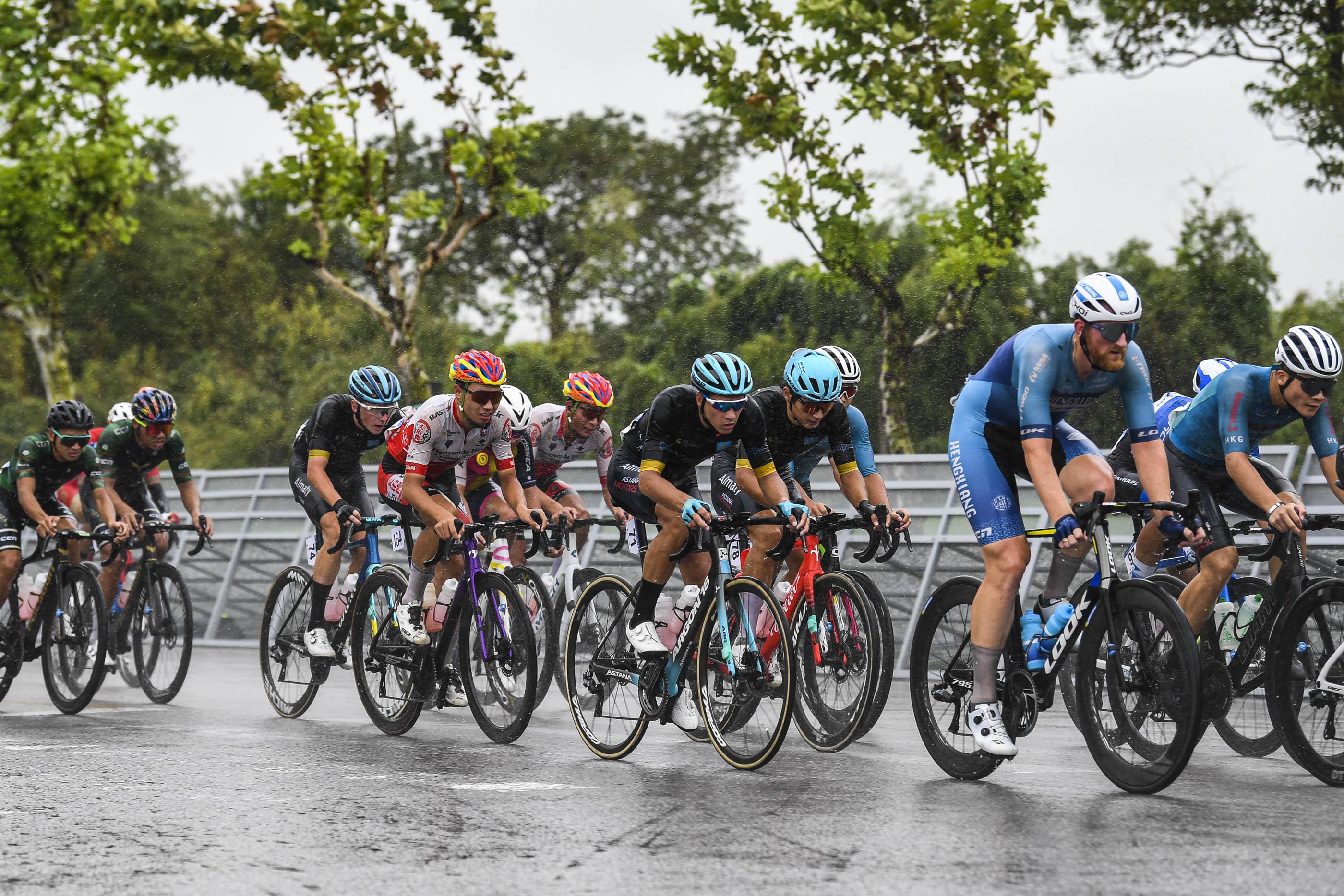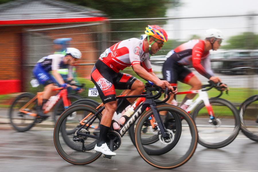 9月20日,2024环上海·新城自行车赛(嘉定站)比赛在上海国际赛车场水景广场鸣枪发车。受台风“普拉桑”影响,自行车选手在风中驰骋,雨中竞速。