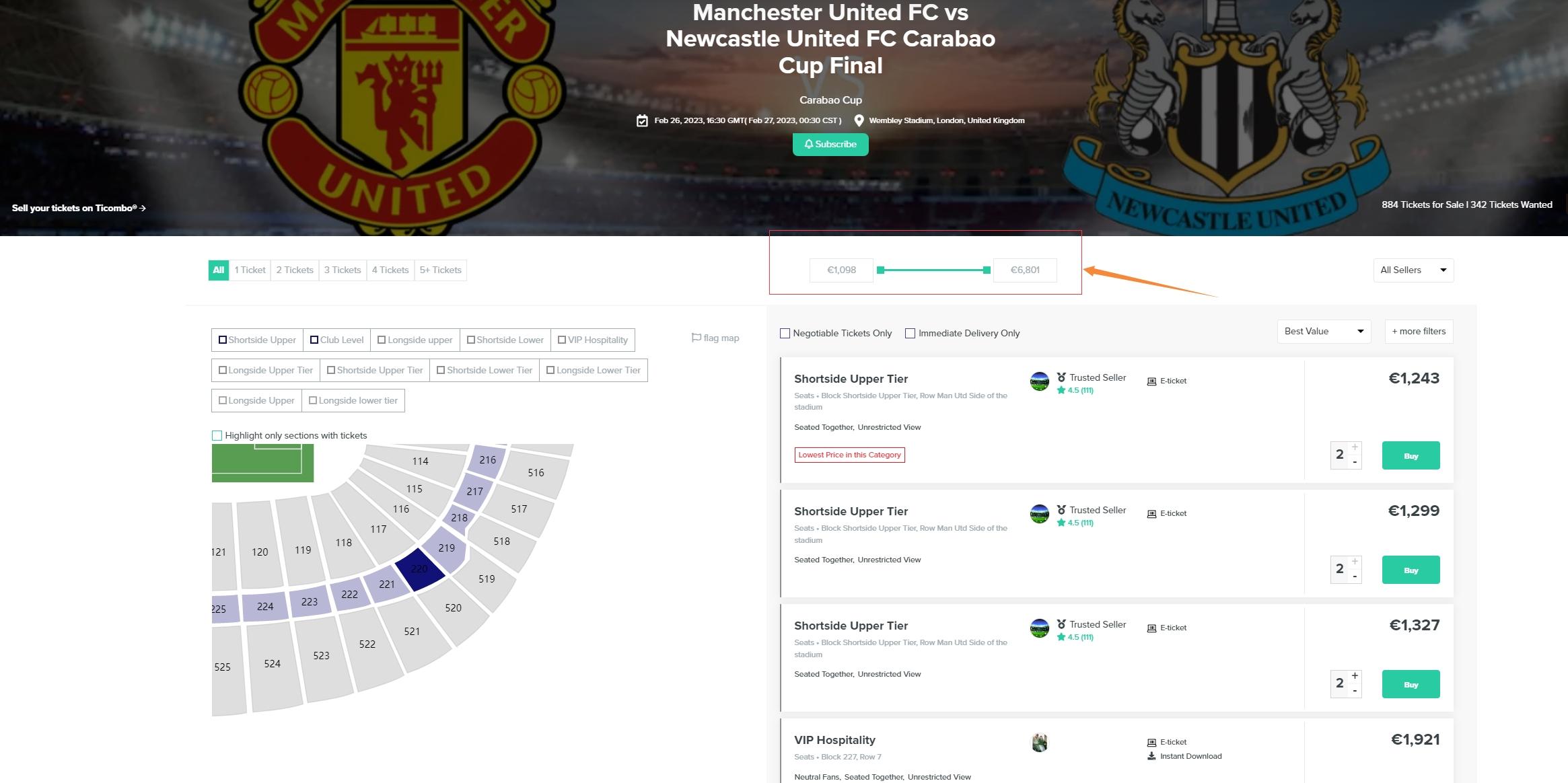本场联赛杯决赛将在容纳9万名观众的新温布利大球场进行,目前在售的门票当中,最低的价格为1096欧元,最高则为6780欧元(价格有所浮动)。