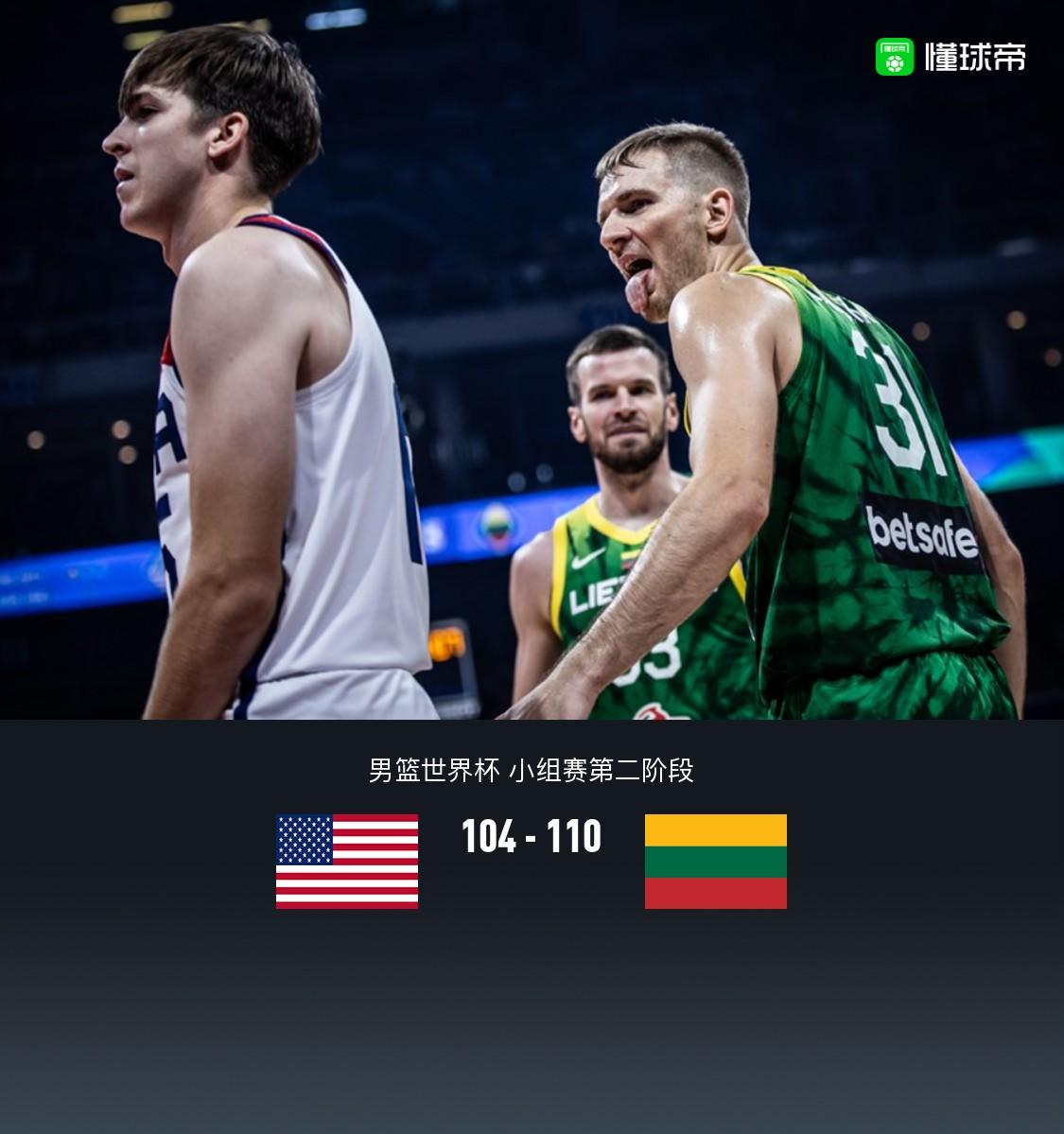 北京时间9月03日男篮世界杯 小组赛第二阶段,美国男篮对阵立陶宛男篮。半场美国男篮37-54立陶宛男篮,最终美国男篮104-110立陶宛男篮,遭遇本届世界杯首败,爱德华兹空砍35分。