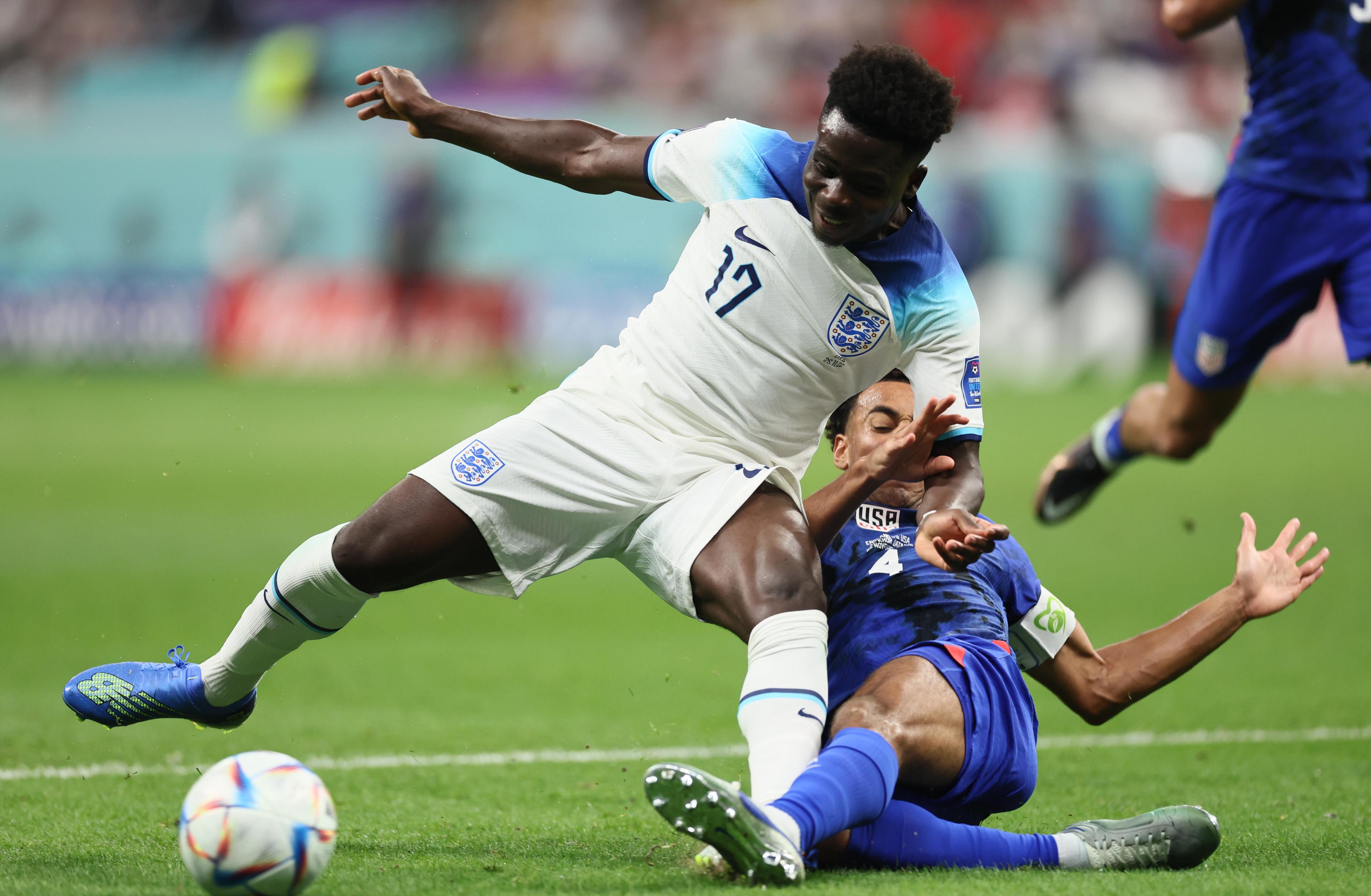 英格兰队球员萨卡(左)与美国队球员泰勒·亚当斯在比赛中拼抢