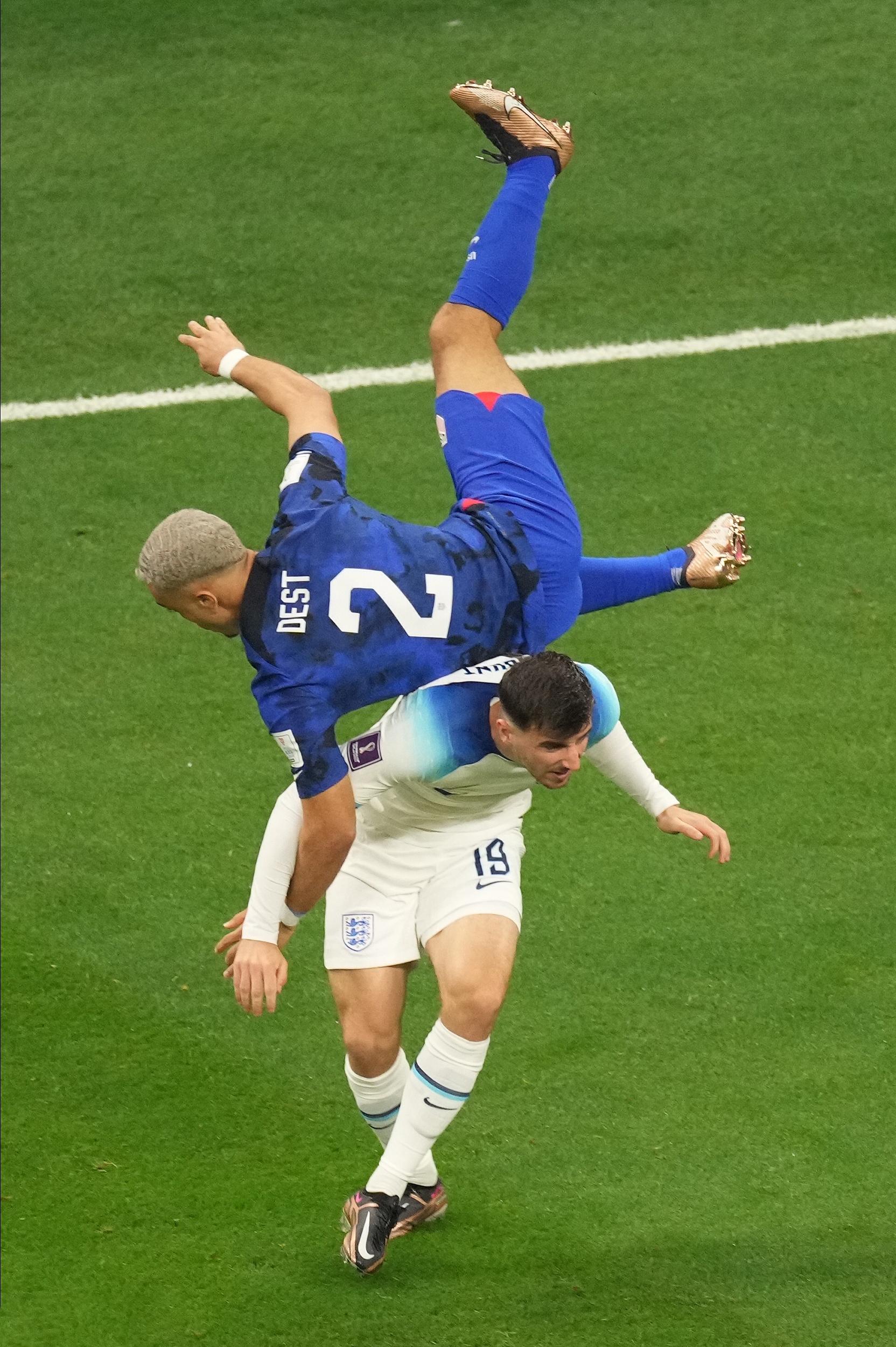 英格兰队球员芒特(左)与美国队球员德斯特拼抢中