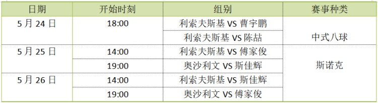 其中,首日为中式八球赛事,由中外选手参赛。随后两天为斯诺克赛事,由奥沙利文、利索夫斯基以及傅家俊、斯佳辉四位选手参加。