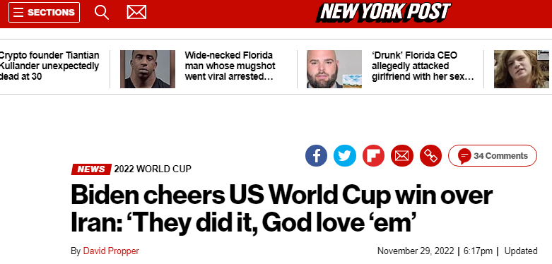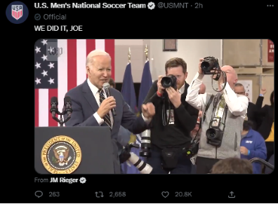 据美国有线电视新闻网(CNN)、《纽约邮报》、《国会山报》等媒体报道,这场比赛赛后,美国总统拜登于当地时间29日密歇根州一场活动中注意到这一赛果,兴奋跑回讲台告诉台下观众并庆祝:他们做到了!