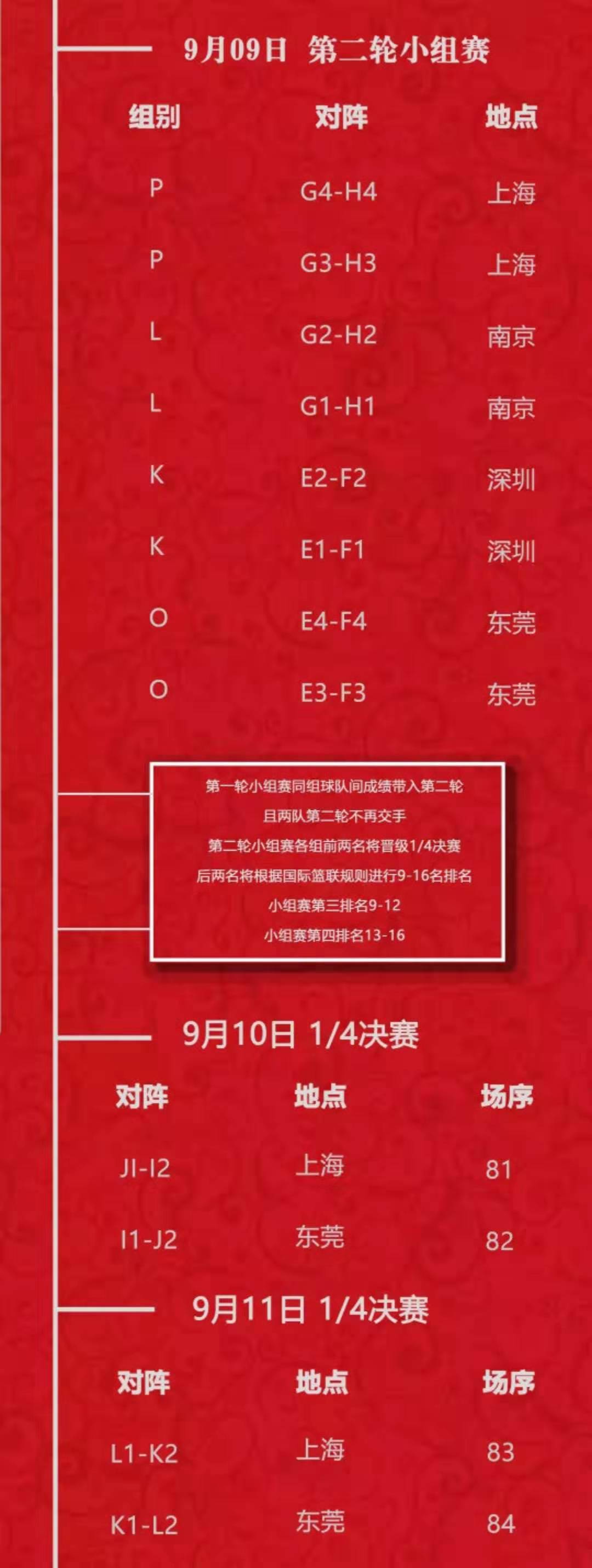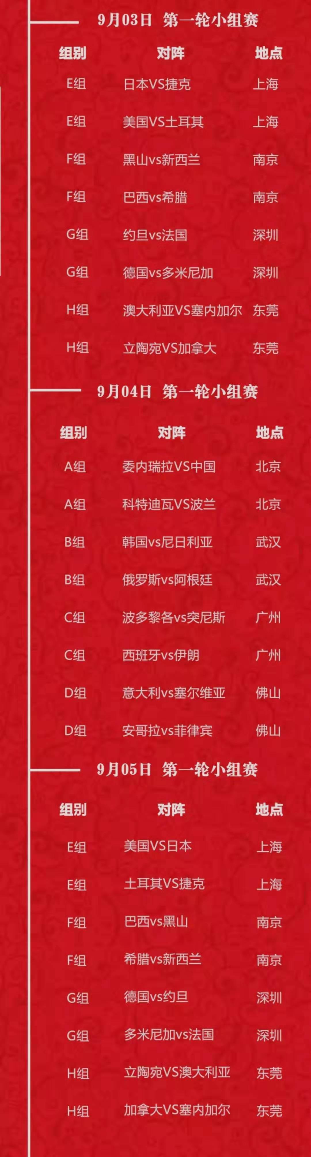 根据赛程安排,中国男篮坐镇北京主场,将与委内瑞拉、波兰和科特迪瓦争夺出线机会;而美国队作为第一种子被分在E组,与土耳其、捷克和日本在上海展开小组争夺。