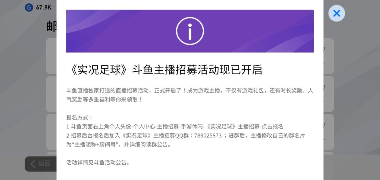 而想参加这次招募活动并成为实况主播呢也不难,直接去斗鱼直播点自己的头像进入个人中心,然后在主播招募里找到"手游休闲"的分类,再去《实况足球》主播招募活动报名就欧克了。当然,官方还通过游戏公告发布了主播群群号,用来办理奖励发放事宜。