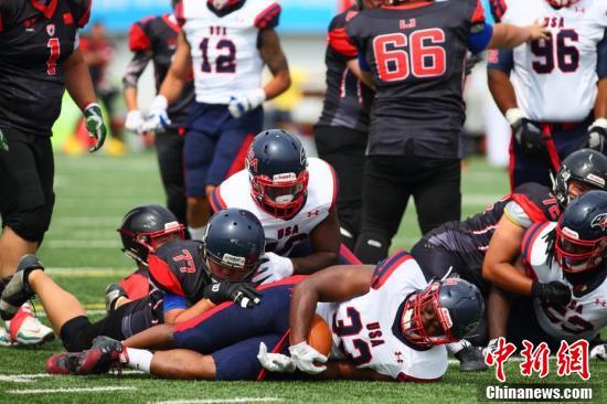 6月14日,2018世界大学生美式橄榄球锦标赛在哈尔滨拉开帷幕,这是世界大学生美式橄榄球第一次走进亚洲,在揭幕战上,中国队0比69负美国队。