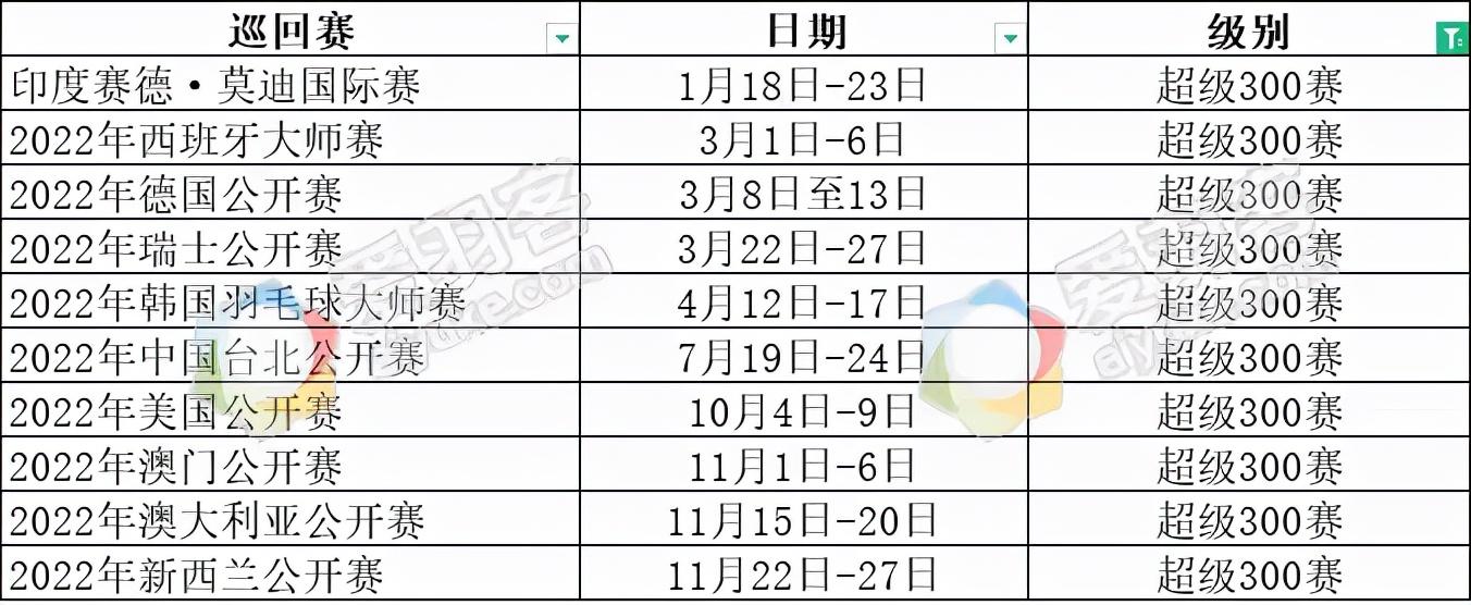 2023世界羽联 赛程 ?8月17日-22日,2021年日本秋田大师赛(super100)8月31日-9月5日,2021年韩国公开赛(super500)9月7日-12日,2021年中国台北公开赛(super300)...