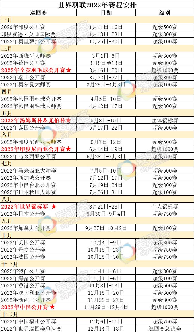北京时间2021年10月28日,世界羽联公布了2022年的全年赛事,2022年世界巡回赛总决赛将在中国广州进行。2022年汤尤杯将于第19周在泰国举行,世界锦标赛将于第34周在日本举行。以下为2022年全年赛程表,喜欢看比赛的小伙伴们赶紧收藏起来!
