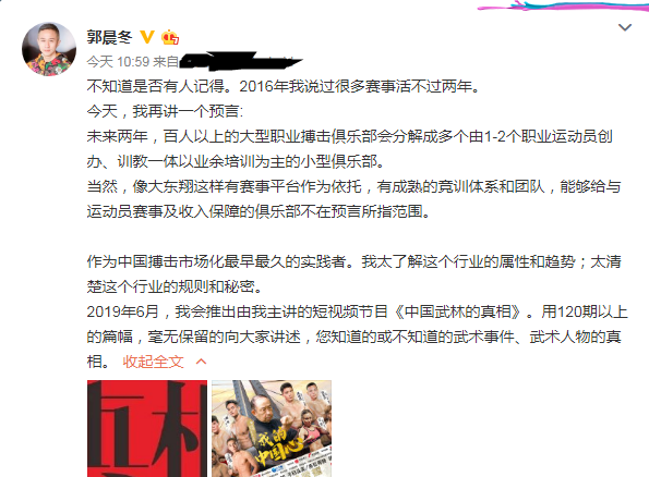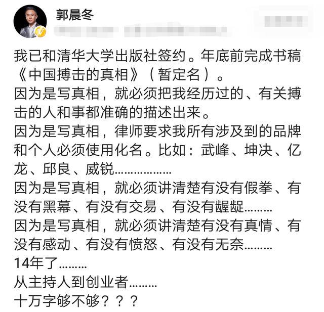 同时他还表示将在下个月推出120期以上的短视频节目《中国武林的真相》,其实这并不是郭晨冬第一次要揭露武林真相,早在去年的时候,他就表示已经和清华大学出版社签约,出一本《中国搏击的真相》,把所经历的有关搏击的人和事都写出来,讲清楚有没有假拳,有没有交易,有没有龌龊。