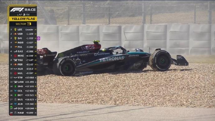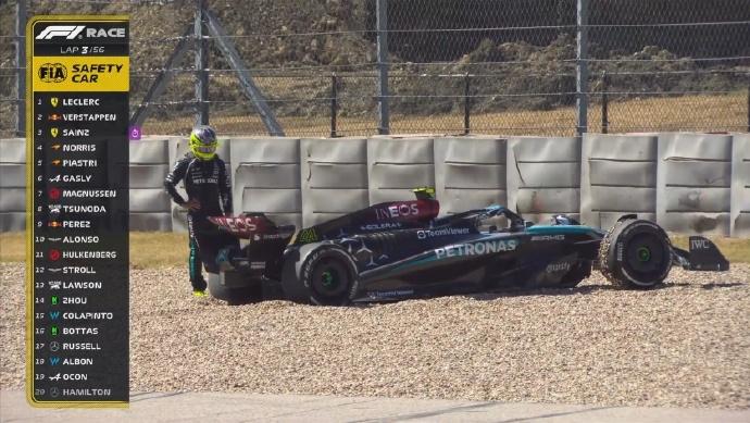 第3圈,汉密尔顿在19号弯出弯处冲出赛道,陷入了砂石地!安全车出来!