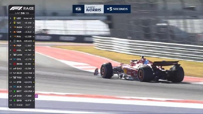 央视网消息:2024年F1美国大奖赛正式比赛在奥斯汀赛道结束,继摩纳哥和意大利之后,勒克莱尔收获赛季第三冠!塞恩斯第二个冲过终点线,法拉利车队赛季第二次包揽冠亚军。维斯塔潘收获第三,汉密尔顿刚起步便发生事故早早退赛,中国车手周冠宇列第19名。