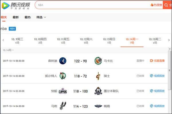 10月14日,腾讯体育的NBA直播单显示,其网站已经恢复NBA部分比赛的视频直播。两场比赛分别为6点公牛对猛龙以及8点以色列马卡比对阵森林狼,目前,这两场比赛已经结束。