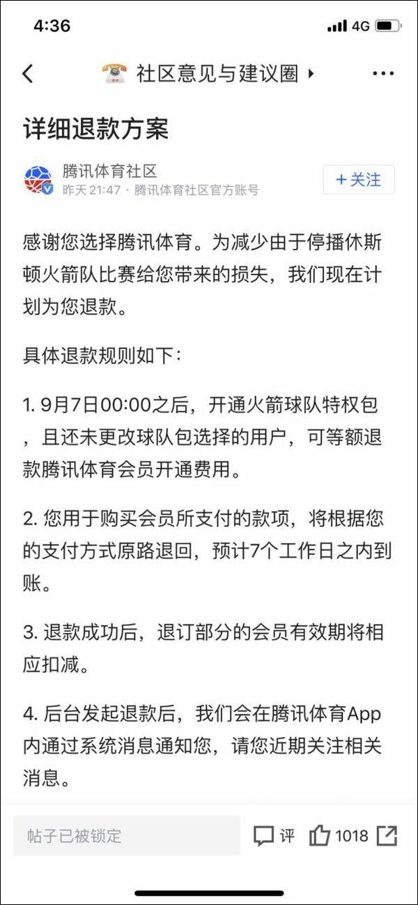 在腾讯体育社区,腾讯还列出了详细的退款方案,具体退款规则有:9月7日00:00之后,开通火箭球队特权包,且还未更改球队包选择的用户,可等额退款腾讯体育会员开通费用;用于购买会员所支付的款项,将根据支付方式原路退回,预计7个工作日之内到账;同时退款成功后,退订部分的会员有效期将相应扣减。