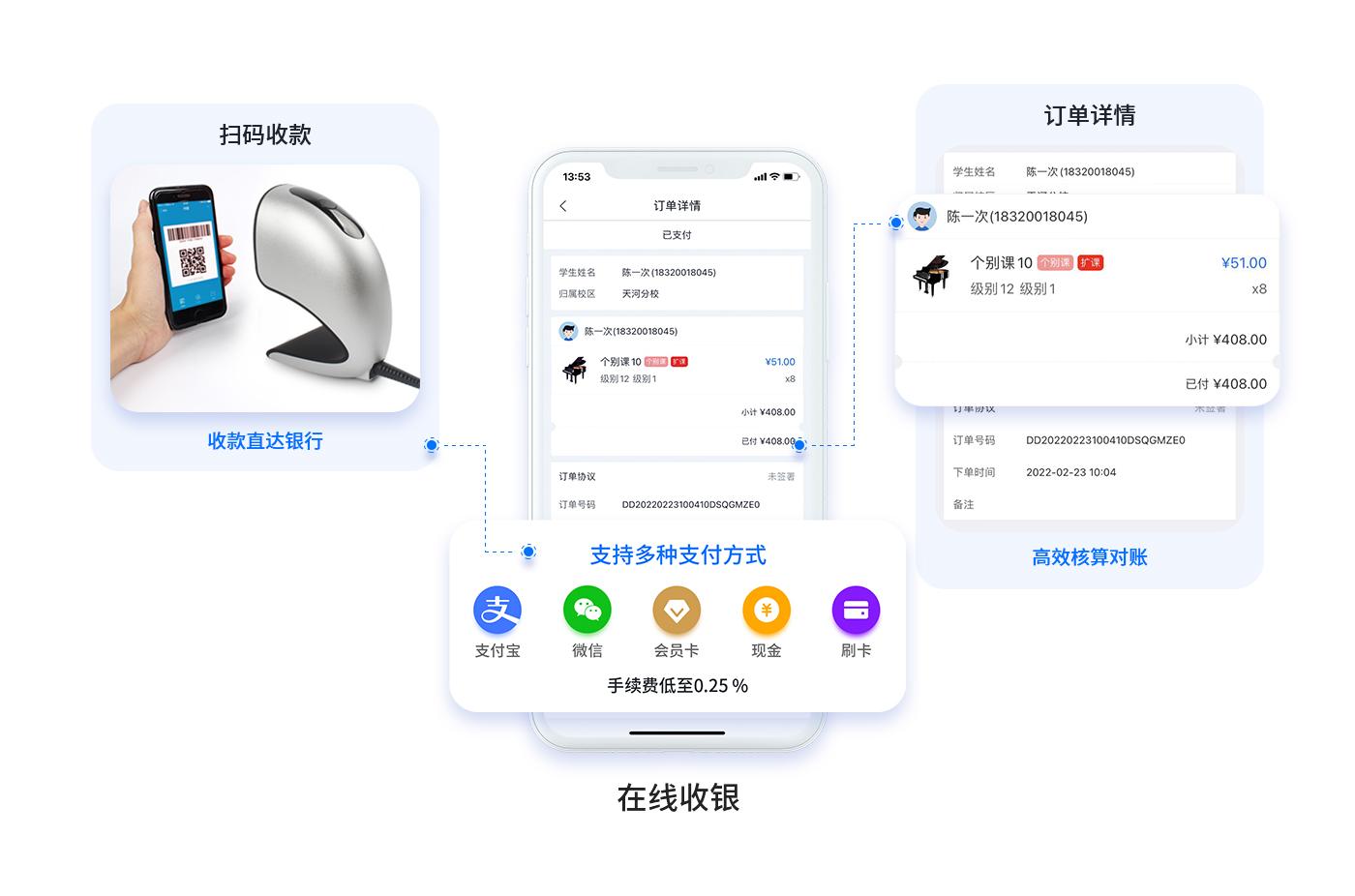 支持会员储值、刷卡消费、挂失、补办、积分、预定等等。
