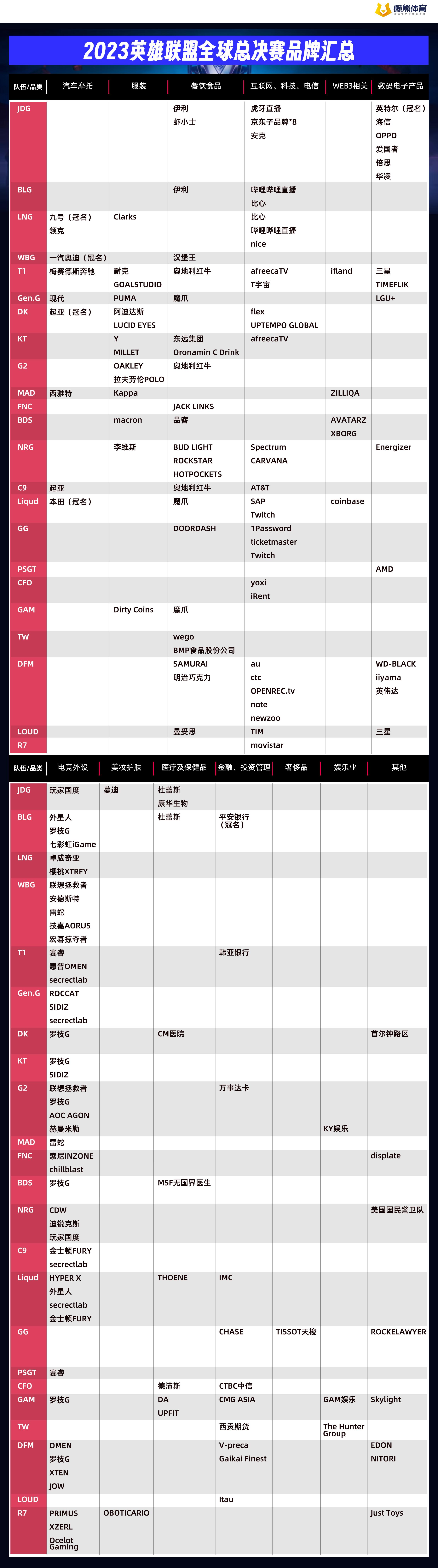 而在俱乐部赞助商方面,品牌整体呈现巨头与特色品牌并存的特性。品类覆盖面极广,横跨超过10个大类以及更多的小项。 作为参与S赛的全球顶级俱乐部,就像欧冠的队伍一样,S赛各队伍的商业吸引力很可观,平均每支队伍超过7个赞助商。四大赛区队伍影响力则更强,平均赞助商数量达到9个。但最多赞助商的依然是日本的DFM战队(18个)。