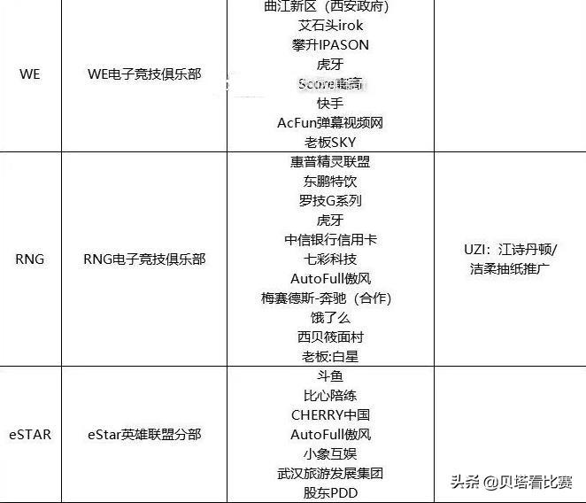 春季赛6-8名的赞助商如下图所示,总的来说还是RNG更有牌面一点,赞助商确实很多,一共有10个,比较搞笑的就是饿了么赞助了RNG,因为RNG这个赛季成绩不好,经常被各种路人网友以及粉丝怒喷打得太下饭了,所以这手饿了么赞助也算是非常贴切了。而RNG这边还有个人赞助,UZI代言了一个是纸巾(暗示无纸不行),还有一个则是名表,价位不敢想象。