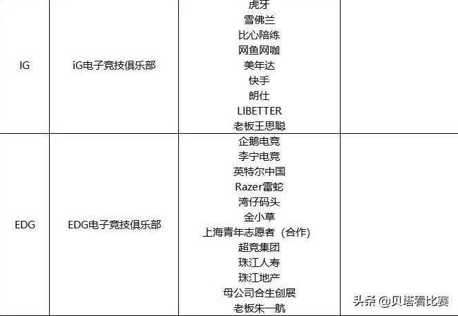 IG也是自从S8世界冠军之后,赞助商就多了起来,目前一共有8个,而且涉及的面也比较广,吃喝玩乐啥都有,算是比较全面的了;EDG作为老牌战队,自然也不会输,赞助商目前有10个,只是有3个都是EDG老板爱德朱的个人企业。