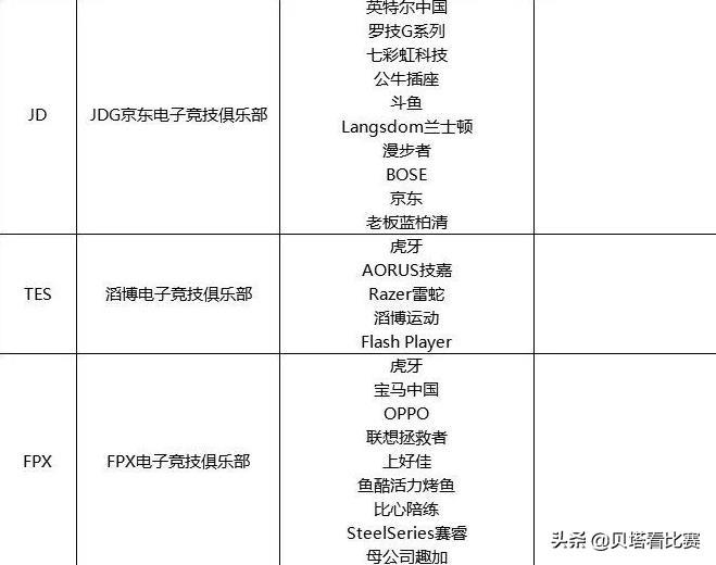 这份表格是按照LPL春季赛的最终名次排列的,首先是JDG,一共有9个赞助商,算是发展的比较不错的了,很多都是和电子设备相关的;TES这边赞助商稍微少一点,只有5个,其中有一个滔搏运动还是自己母公司;FPX因为拿下了S9世界冠军,所以赞助商也很多,一共有8个,从吃的到用的,再到开的,应有尽有。