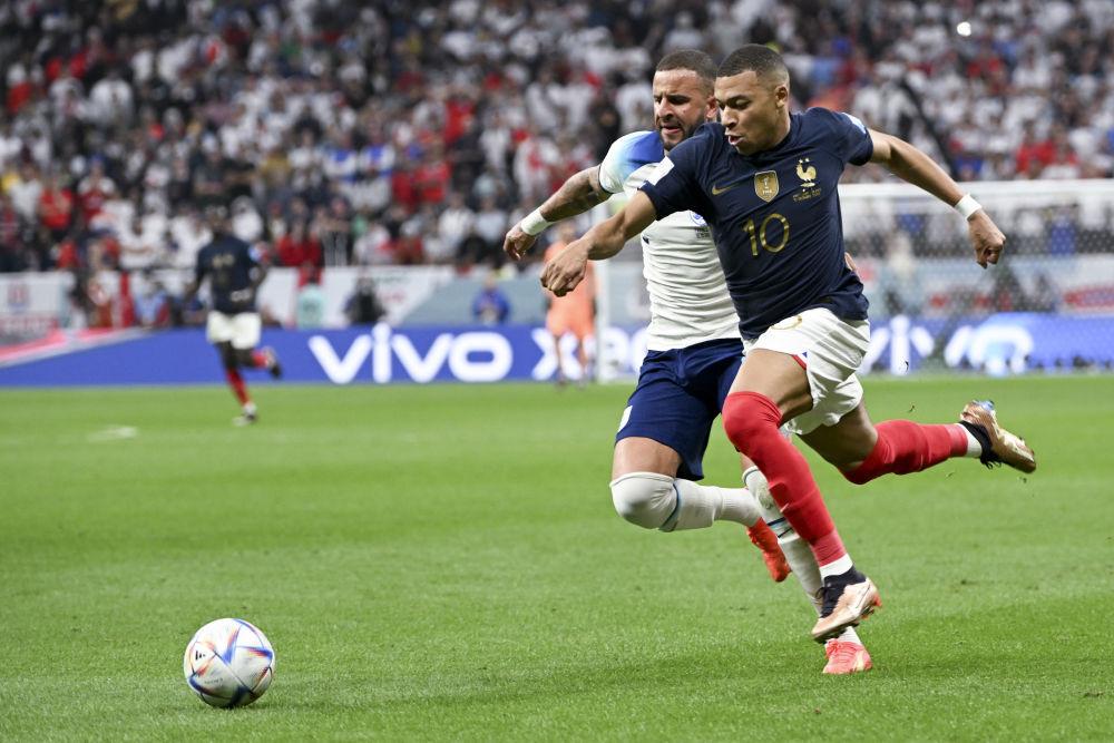 法国队球员姆巴佩(右)与英格兰队球员沃克在比赛中拼抢。新华社记者李尕摄