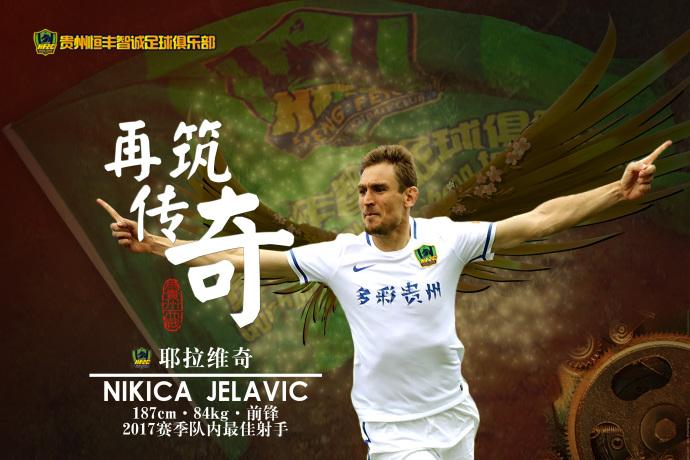 经与北京人和足球俱乐部及球员本人友好协商后达成一致,克罗地亚籍球员耶拉维奇(Nikica Jelavic) 将正式转会加盟贵州恒丰智诚足球俱乐部。新合同为期3 年,至2020 年底。耶拉维奇出生于1985 年,身高187cm,司职前锋。2017 年初从北京人和足球俱乐部租借加盟贵州恒丰智诚足球俱乐部。在2017 赛季的中超征途中,耶拉维奇为贵州恒丰智诚出战26场,打入15球、贡献4 次助攻,个人争顶成功率超过80%。