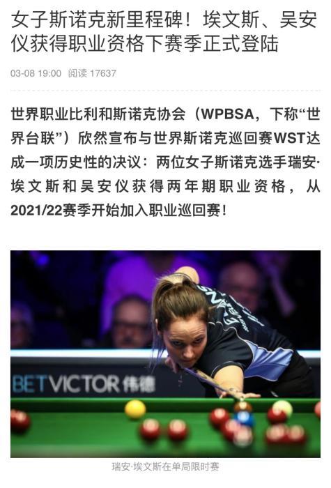 中新网3月9日电 北京时间8日晚,世界台联宣布与世界斯诺克巡回赛WST达成一项历史性的决议:两位女子斯诺克选手瑞安-埃文斯和吴安仪获得两年期职业资格,从2021/22赛季开始加入职业巡回赛。
