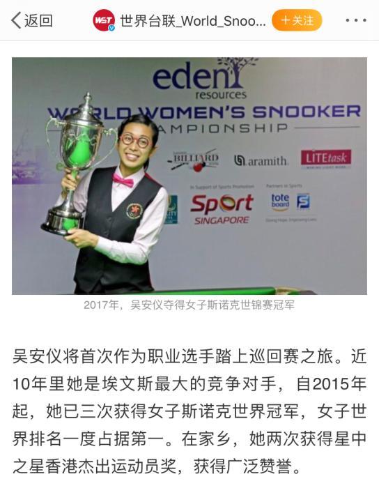 吴安仪将首次作为职业选手踏上巡回赛之旅。近10年里她是埃文斯最大的竞争对手,自2015年起,她已三次获得女子斯诺克世界冠军,女子世界排名一度占据第一。