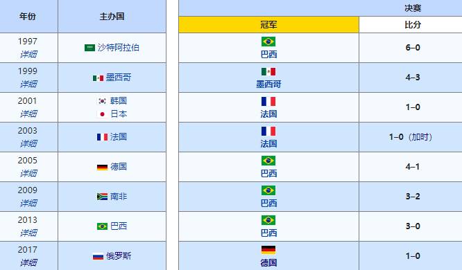 2006年德国世界杯,此前两届联合会杯冠军巴西在八强不敌法国、法国在决赛不敌意大利。