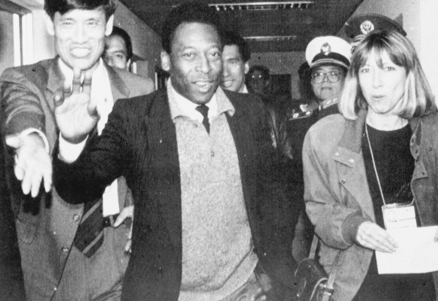 图为1991年11月26日,“球王”贝利乘飞机到达广州。他应国际足联邀请,前来观看首届女足世界杯半决赛和决赛。新华社记者张肄文摄
