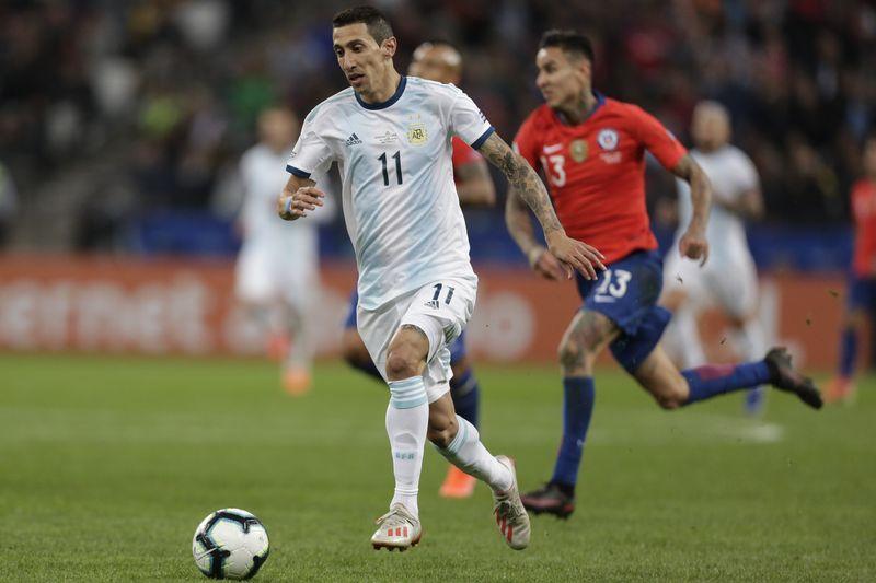7月6日,阿根廷队球员迪马利亚(前)在比赛中带球突破。新华社发(弗朗西斯科·卡涅多摄)