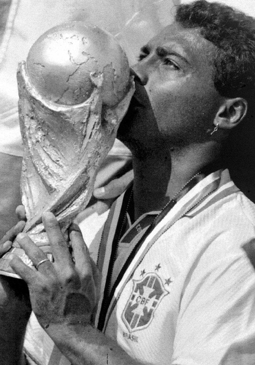 图为1994年7月17日,巴西队前锋罗马里奥在领奖台上亲吻金杯。当日,在洛杉矶进行的世界杯足球赛决赛中,巴西队和意大利队在120分钟的比赛中战成0比0平,经过点球决赛,巴西队最终以3比2战胜意大利队,夺得冠军,成为世界杯历史上第一支四次获得冠军的球队。新华社发