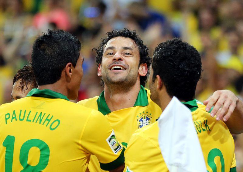 2013年6月30日,在巴西里约热内卢举行的2013联合会杯决赛中,巴西队3:0战胜西班牙队,夺得冠军。图为巴西队球员弗雷德(中)与队友庆祝进球。