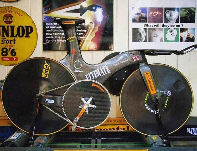 伯斯福德 是一个痴迷于速度的英国车手,受F1的启发,他发明了一辆自行车,它配备了充满氦气的硅胶轮胎、陶瓷轴承和一个惊人的60厘米牙盘,他在室内滚筒下创造了341公里/小时的极速。当然他这个极速,前期也是在使用牵引力的作用下达到的。