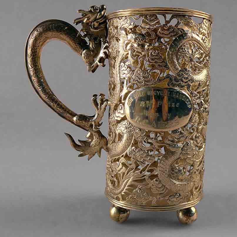 上海市历史博物馆收藏近代上海银器种类丰富。从功用而言,近代上海银器有社交礼物,首饰、餐饮器具、体育比赛奖品类……近代上海,中西交汇,海纳百川,体育也不例外。开埠后,中国传统的体育项目,如象棋等,依然活跃在民间,但更多的是随外侨而至的近代体育项目。上海是近代外侨人数最多、最集中的城市。外侨是近代体育运动的积极推动者、参与者。伴随着近代体育项目在上海的展开,外国人在体育比赛中颁发银质体育奖品的习惯也在上海流行开来。早在1863年,上海外侨搜狐比赛中就颁发银质奖品。