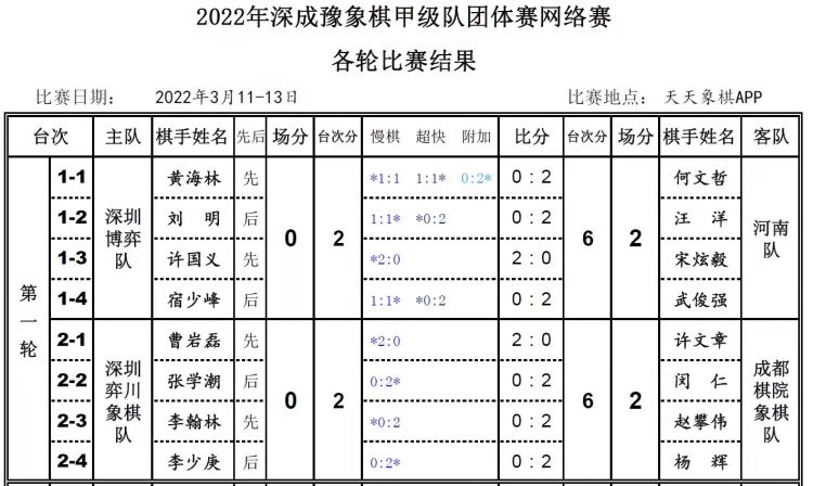 经过第一个比赛日的激烈角逐,河南队暂时第1,深圳弈川象棋队和成都棋院象棋队暂列第2。