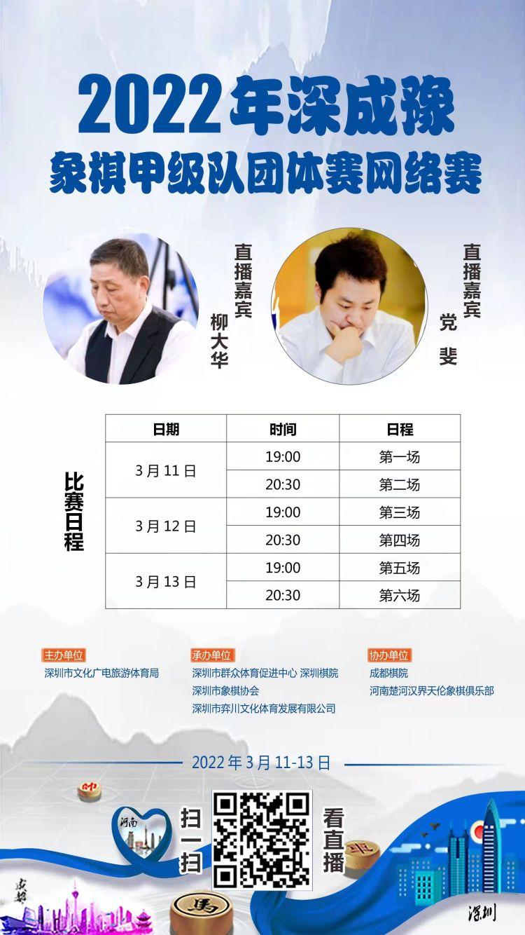 3月11日,2022年深成豫象棋甲级团体赛网络赛开幕式在福田奥林匹克大厦举行。深圳弈川象棋甲级队、深圳博弈象棋队、成都棋院象棋队、河南楚河汉界天伦象棋队4支队伍线上交锋,将于13日决出冠军。