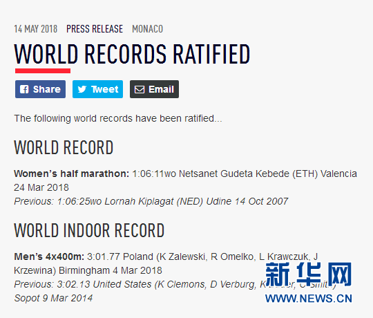 国际田联官网在5月14日发布消息称,女子半程马拉松和男子室内4x 400米世界纪录已经获得批准。由此,女子半程马拉松的世界纪录由1小时06分25秒提高到1小时06分11秒。