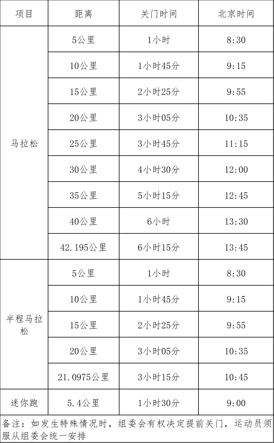 (一)按照中国田径协会审定的最新田径竞赛规则、中国田径协会路跑赛事管理办法、世界田联标牌路跑赛事规则和本届马拉松赛竞赛规程执行。 (二)比赛检录: 1.在规定的检录时间内到指定区域进行集结,特邀运动员须于赛前30分钟在指定检录区进行单独检录,未参加检录的其成绩将不作为官方比赛成绩。比赛发令15分钟后,不允许选手进入赛道起跑;2.大众选手采取检查感应计时芯片和号码布的方式逐一检录。选手需在规定的时间内,到相应区域进行检录;3.所有参赛选手须正确佩戴号码布于胸前,特邀运动员必须在比赛时胸前、背后各佩戴一块号码布;4.不允许后区进入前区检录起跑,但前区可进入后区检录起跑。 (三)起跑顺序: 按①特邀运动员②马拉松大众参赛选手(按选手报名成绩排序,以2020年12月31日至报名截止日期在中国马拉松信息平台公布的A1类赛事成绩为准)、③半程马拉松大众参赛选手(按选手报名成绩排序,以2020年12月31日至报名截止日期在中国马拉松信息平台公布的A1类赛事成绩为准)、④迷你跑大众参赛选手顺延排列,依次出发。 (四)发令: 采用一枪发令同时起跑的办法。 (五)计时办法: 1.比赛采用感应计时,感应计时芯片将在参赛选手通过起点线开始计时,选手须佩戴组委会提供的一次性计时芯片参赛方可有效;2.在起点、每5公里点、21.0975公里点、折返点和终点均设有计时感应地毯,参赛选手行进过程中必须逐一通过所有的地面计时感应地毯。如在关门时间内完成比赛但缺少任何一个计时点的成绩,将不予排名。 (六)关门时间和距离: 为保证参赛选手比赛安全和城市道路交通秩序,各公里点关门后,比赛计时感应地毯即停止工作,赛道解除交通管制并恢复道路正常交通,参赛选手应及时停止比赛退出赛道。退出比赛的选手可搭乘组委会提供的收容车或自行选乘公共交通抵达相应项目的终点。否则,由此引发的事故将由该选手自行承担相应法律责任和赔偿责任。 关门时间以发令枪声时间计时,具体见下表: (七)存取衣物: 1.马拉松、半程马拉松项目参赛选手须按照规定在起点指定区域按号段寄存个人物品,结束比赛后凭本人号码布到赛后服务区对应号段的区域领取个人物品。组委会建议不要将贵重物品存放在包内(如手机、有效证件、现金、各种钥匙、信用卡、平板电脑等),若发生损坏或遗失,由参赛选手本人承担;2.比赛日取包截止时间:半程马拉松选手请在12:00前,马拉松选手请在15:00前到取包区域领取个人寄存物品,如未能按时领取个人物品者请于赛后5个工作日内到组委会办公室办理领取,联系电话:0575-88588981。逾期未领取的物品,组委会将按无人领取处理;3.迷你跑不提供存取包服务。 (八)饮水、饮料、能量补给站点: (九)医疗救护: 1.在比赛起点和赛道沿途(每2.5公里)及终点均设固定医疗点和急救车辆; 2.赛道沿途配备流动AED医疗救援服务工作人员; 3.赛道沿途配备医疗服务志愿者,协助医疗救护及维护比赛秩序,参赛选手可随时向他们请求帮助。在比赛中,医疗相关负责人有权根据选手身体状况下达指令终止选手比赛并收取其号码布,若参赛选手不听从现场医务人员建议,坚持参赛产生的一切后果及责任由参赛选手本人承担,若选手丧失意识,则自动委托组委会采取一切手段进行急救,包括但不限于CPR心肺复苏、AED体外除颤、急救车辆或航空设备进行快速转运等。 (十)本次比赛将按照有关规定对参赛获奖选手进行兴奋剂检查。 (十一)比赛成绩证书领取。在赛事结束后24小时内比赛芯片计时成绩将上传至赛事官方网站,并进行公示。在规定关门时间内完赛的参赛选手,赛后请登录绍兴马拉松官方网站(sxym.org.cn)进行成绩查询、下载或打印成绩证书。 (十二)有关竞赛的其他具体要求和安排,请详细阅读《官方手册》。十一、参赛办法