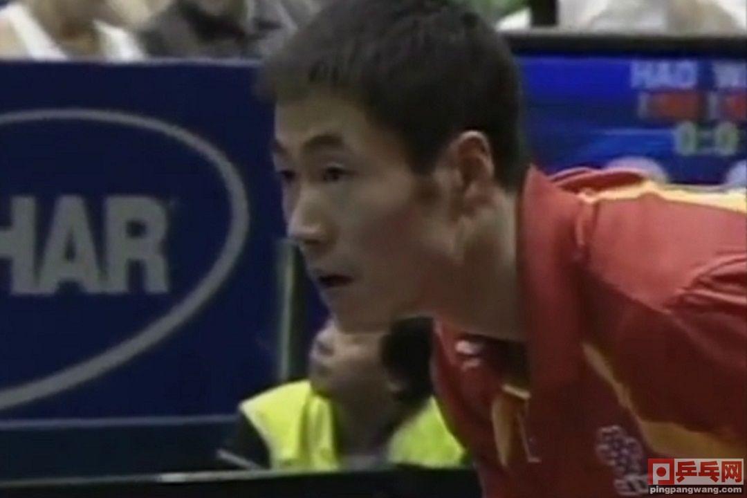 郝帅发中路短球,王励勤摆短,郝帅暴冲中路,7-9。