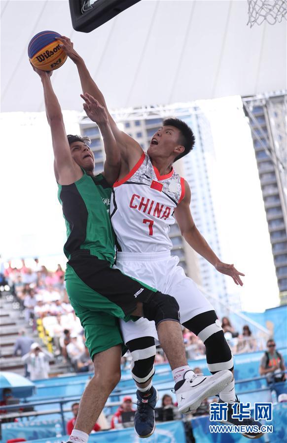 10月9日,中国队球员郭继旺(右)在比赛中封盖。 当日,在阿根廷布宜诺斯艾利斯举行的第三届夏季青年奥林匹克运动会三人篮球项目男子组预赛A组比赛中,中国队通过加时赛以16比14战胜土库曼斯坦队。 新华社记者孟永民摄