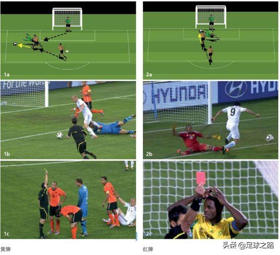 1. 如果进攻球员没有头球攻门,守门员并不会被罚出场, 因为他没有故意破坏明显进球机会。他将拿到黄牌警告,并判罚球点球(图中 1a-1c);