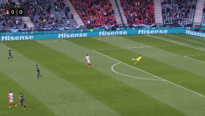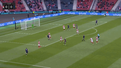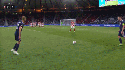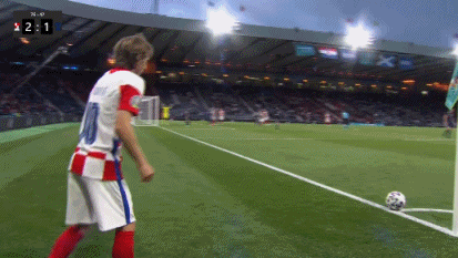 第61分钟,科瓦西奇将球分给弧顶跟进的莫德里奇,后者迎球直接外脚背世界波,球直飞大门,克罗地亚2-1苏格兰。↓