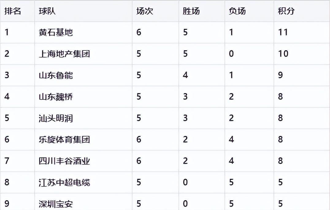 黄石基地的综合表现出色,目前5胜1负积11分,领跑男团积分榜。尽管山东魏桥和汕头明润还有直接交锋,但是黄石基地暂未锁定前四。黄石基地接下来的2场都不好打,将分别对战山东鲁能和上海队,赢下其中1场必进4强。