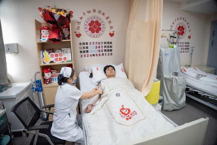 6月13日,江西南昌,谢志龙(右)正在进行造血干细胞的捐献。