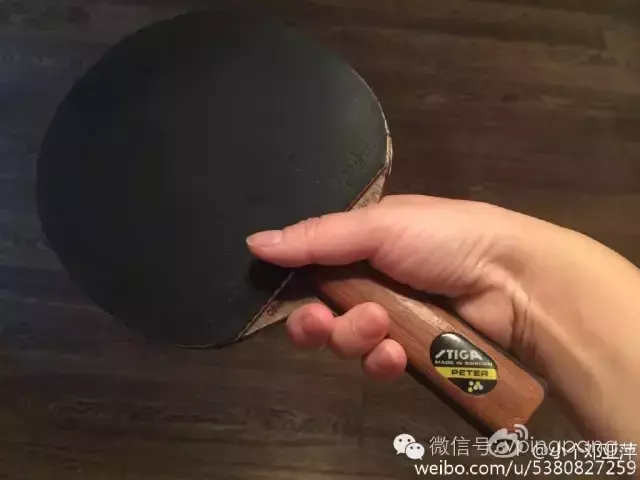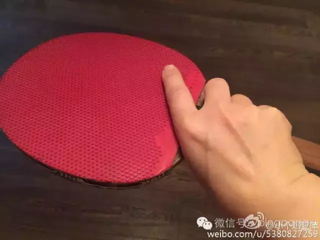 中指、无名指和小指三只弯曲握住手柄,食指伸直贴在球拍背面,靠近边缘。