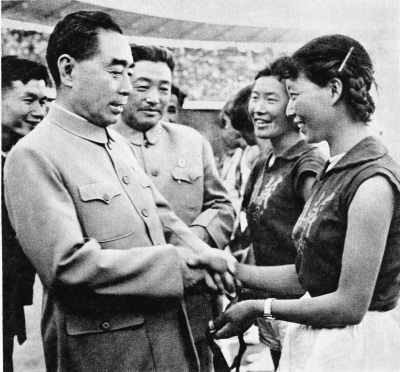△第一届全国运动会期间,周恩来、贺龙等接见参赛运动员