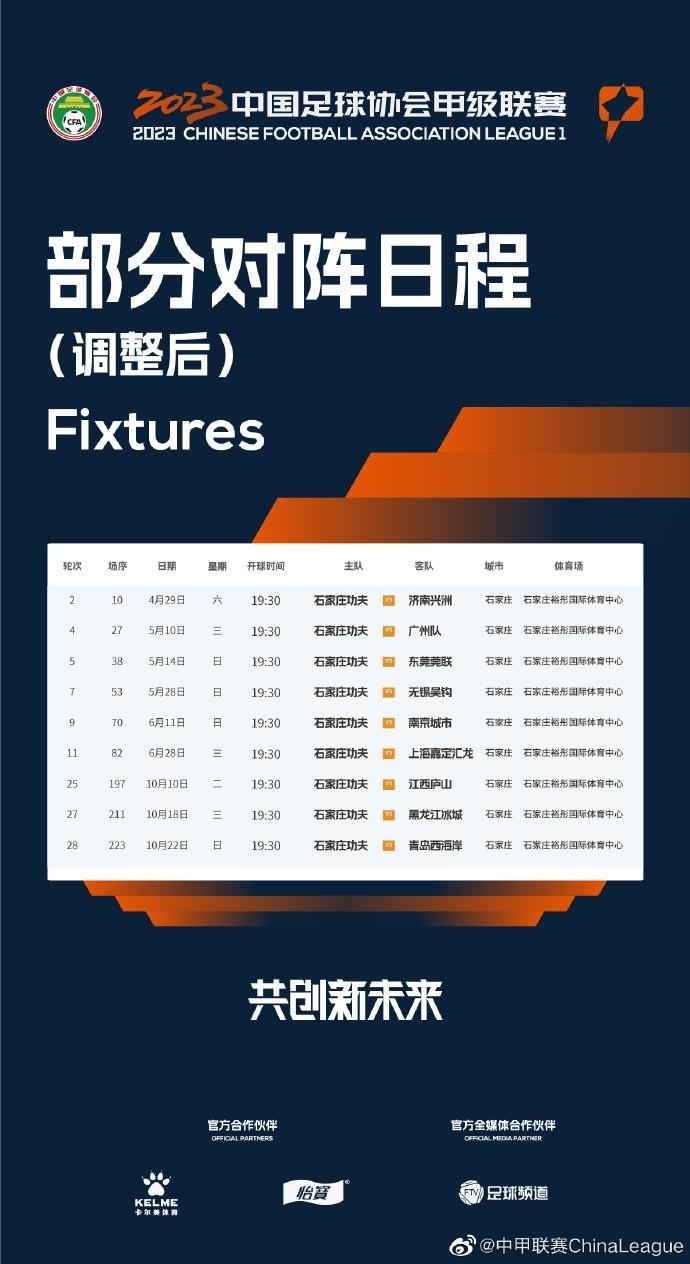 经河北石家庄赛区、石家庄功夫足球俱乐部申请,2023中甲联赛委员会研究决定,同意调整石家庄功夫队部分主场比赛开球时间,由15:30调整为19:30进行。比赛日期和比赛场地不变。