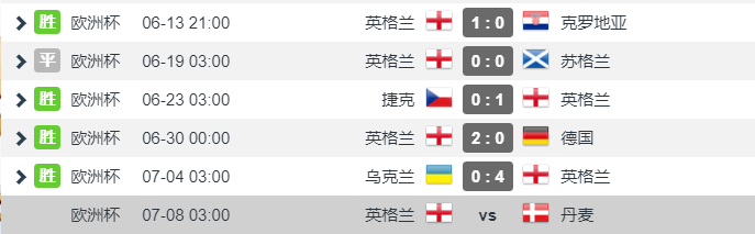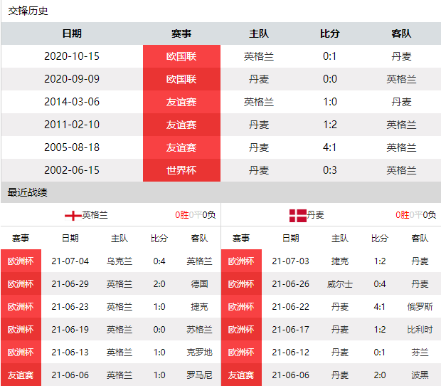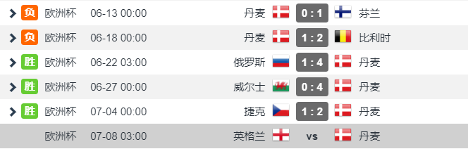 双方近6次交手,英格兰3胜1平2负,略占上风;去年两次交手,英格兰面对丹麦1平1负未尝胜绩 。英格兰各项赛事近6场比赛5胜1平,除了0-0苏格兰,剩余比赛均击败对手,战绩非常彪悍;丹麦各项赛事近6场比赛4胜2负,近3场欧洲杯均击败对手,埃里克森恢复健康之后,丹麦全力全开,他们有身体有技术,会是英格兰一个难缠的对手,去年主客场面对英格兰1胜1平保持不败,这会给丹麦球员信心。