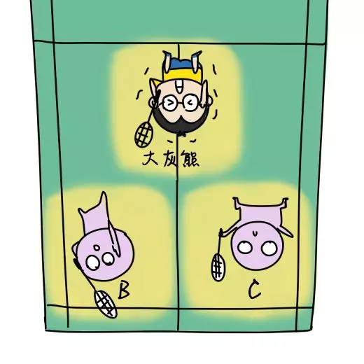 而三打三发球时,按照上图大灰熊的站位(T位),BC在中后场平行站位,把住后场两点,不管对方接发球平推到哪边,还需要害怕啥?轻轻送就可以把球顶回去,也正因为一人守一边,移动少,所以发力更集中,速度也快;如果对方挑球,显然发球方这边是不用大面积左右移动就能杀球的。