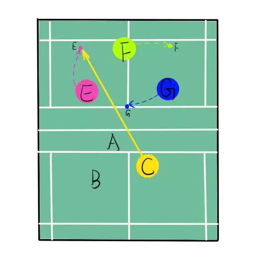 第一拍,如下图,C发球偷E后场,这时,G就能迅速往中间补位,后场就形成了两人(EF)进攻;